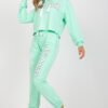 A sweatshirt set consisting of a sweatshirt and pants. Sweatshirt with long sleeves and a hood. Long pants with high waist, elastic waistband and binding, slip pockets on the sides.