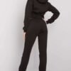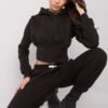 Women’s sweatshirt set consisting of a sweatshirt and pants. Short sweatshirt with long sleeves and a hood. Long pants with a tie at the waist and slip pockets.