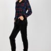 Ladies’ velour set consisting of a blouse and pants. Long-sleeved blouse made of fabric in an interesting checkered pattern. Long black pants with slip pockets.
