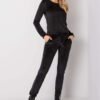 Velour set consisting of a blouse and pants. Blouse with long sleeves and round neckline. Long pants with a tie at the waist and slip pockets.