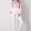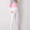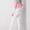 A sweatshirt set consisting of a sweatshirt and pants. Sweatshirt with long sleeves and round neckline. The sweatshirt is made of fabric in three colors. Long pants with elastic waistband, tie ties and slip pockets.