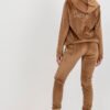Ladies’ velour set consisting of a sweatshirt and pants. Sweatshirt with long sleeves and a hood. Long pants with a tie at the waist and slip pockets. The set is decorated with interesting embroidery.