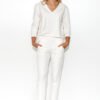 Elegant women’s tracksuit set. The minimalist blouse has a deep v-neck, long sleeves and interesting modeling stitching. A delicate patch with the letter M was sewn on the front. The women’s blouse looks extremely chic on the figure. Pants with a straight leg are its perfect complement. They also feature stitching, which gives the set a business chic look. On the sides, slip pockets are available. On the waist line, a thick elastic drawstring has been sewn into the pants. This makes the pants fit even better on a woman’s figure.