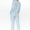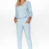 Elegant women’s tracksuit set. The minimalist blouse has a deep v-neck, long sleeves and interesting modeling stitching. A delicate patch with the letter M was sewn on the front. The women’s blouse looks extremely chic on the figure. Pants with a straight leg are its perfect complement. They also feature stitching, which gives the set a business chic look. On the sides, slip pockets are available. On the waist line, a thick elastic drawstring has been sewn into the pants. This makes the pants fit even better on a woman’s figure.