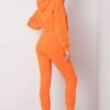A sweatshirt set consisting of a sweatshirt and pants. Shorter sweatshirt with long sleeves and a hood. Long pants with a more fitted cut, with a tie at the waist and slip pockets.