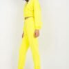 A sweatshirt set consisting of a sweatshirt and pants. Short sweatshirt with long sleeves, hood and envelope neckline. Long pants with waist tie and slip pockets.