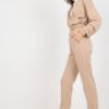 A sweatshirt set consisting of a sweatshirt and pants. Short sweatshirt with long sleeves, hood and envelope neckline. Long pants with waist tie and slip pockets.