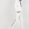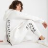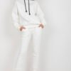 A sweatshirt set consisting of a sweatshirt and pants. Sweatshirt fastened on the back, with long sleeves and a hood. Long pants with waist tie, slip pockets and zippers.