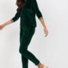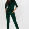 Women’s velour set consisting of a sweatshirt and pants. Sweatshirt with 3/4 sleeves and a hood. Long pants with a tie at the waist and slip pockets. The set is finished with ribbed cuffs with a decorative print.
