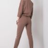 Women’s tracksuit set consisting of a sweatshirt and pants. Blouse with 3/4 sleeves and a small stand-up collar. Long pants with a tie at the waist and slip pockets. Decorative inscription on the front and collar.
