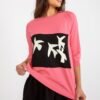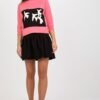 A sweatshirt set consisting of a sweatshirt and a skirt. Blouse with 3/4 sleeves and round neckline. Decorative print on the front. Skirt with higher waist, zipper and button closure.
