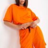 Cotton women’s set consisting of a blouse and shorts. Blouse of a looser cut with short sleeves and a round neckline. Shorts with binding at the waist and slip pockets. Set with decorative patches.