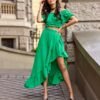 The asymmetrical blouse and skirt set is made of soft, pleasant fabric that will provide comfort to the most demanding women. The set includes a short top and an asymmetrical skirt. The top is characterized by beautiful exposed shoulders and frills at the waist and neckline. The skirt, on the other hand, impresses with a wonderful asymmetrical cut, ruffles at the front and an elastic waistband that will fit any figure. The summer set will perfectly suit any type of beauty, as it has a large range of colors. The product is made and sewn in Poland.