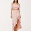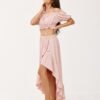 The asymmetrical blouse and skirt set is made of soft, pleasant fabric that will provide comfort to the most demanding women. The set includes a short top and an asymmetrical skirt. The top is characterized by beautiful exposed shoulders and frills at the waist and neckline. The skirt, on the other hand, impresses with a wonderful asymmetrical cut, ruffles at the front and an elastic waistband that will fit any figure. The summer set will perfectly suit any type of beauty, as it has a large range of colors. The product is made and sewn in Poland.