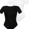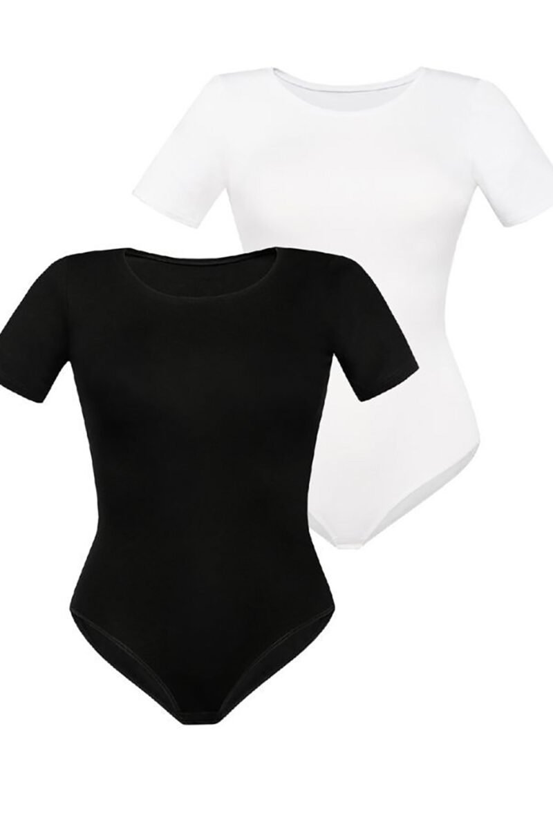 We present a unique set of two short-sleeved bodysuits in white and black. Made of high-quality material that contains viscose with added lycra, these bodysuits provide not only excellent wearing comfort, but also durability. The bodysuits feature a round neckline, which gives them a classic feel and makes them a versatile addition to a variety of outfits. Their short sleeves add charm and make the bodysuits ideal for warmer days or as a base layer under other clothes. The classic cut of the bottom of the bodysuit is not only aesthetically pleasing, but also functional, allowing free movement. The adjustable hook-and-eye closure guarantees a perfect fit to your preferences and figure. A classic set of two bodysuits in white and black is an indispensable piece of closet. Their high-quality material, comfortable cut and practical details, make them indispensable in your closet.