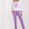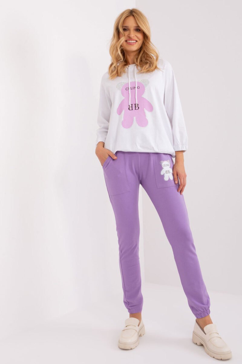 A sweatshirt set consisting of a sweatshirt and pants. Sweatshirt with long sleeves and round neckline. Decorative print in the shape of a teddy bear on the front. Long pants with a tie at the waist and pockets.