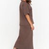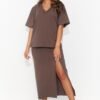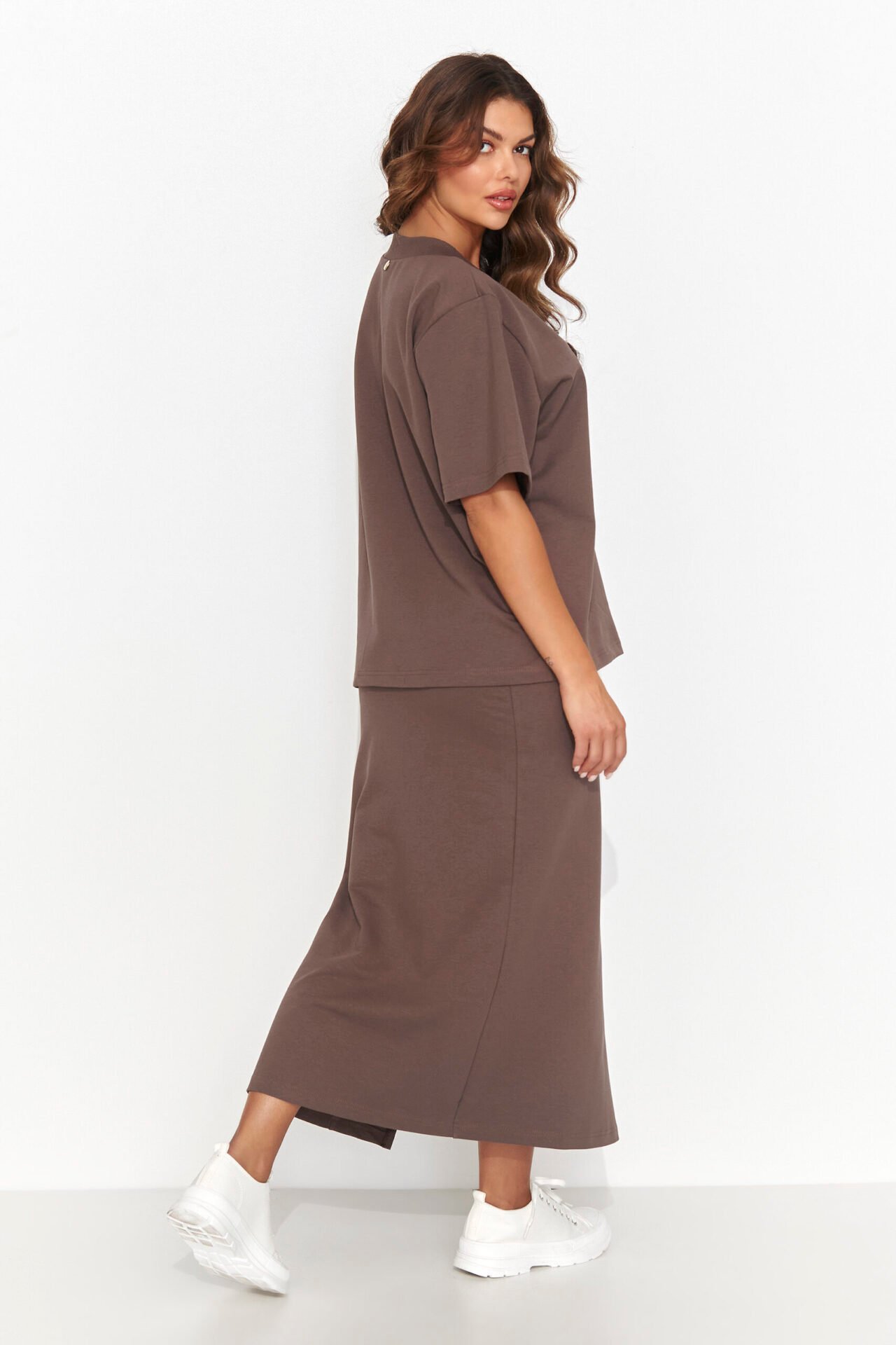A women’s set that exudes elegance and casualness, consisting of a knee-length pencil skirt with a delicate slit and a loose-fitting short-sleeved shirt with a heart-shaped neckline. The eye-catching detail is a decorative gold plate, placed at the back of the blouse, adding a touch of subtle extravagance. This set is available in three charming colors: light beige, black and chocolate, allowing you to adapt it to different occasions and styling. The pencil skirt accentuates the feminine silhouette while providing comfort, while the loose shirt adds lightness and freedom. This is the perfect combination of classic and modern, which is sure to attract the attention of fashion fans.