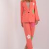 The set of jacket and pants is a perfect combination of elegance and style, which will be perfect for a variety of occasions from work, through business meetings, to special evening outings. Characteristic decorative flowers placed on the front of the pants and jacket add originality and subtle finesse to this set. Made mainly of polyester, the jacket and pants maintain an elegant look while offering freedom of movement. The floral appliqués are a delicate but striking detail that adds a sophisticated touch to the complete set. The long length of the pants and jacket gives the set a formal tone, ideal for more formal occasions. The straight trouser legs and high rise emphasize the classic cut, which is both timeless and stylish. The long sleeves and wide lapels of the jacket add to the overall elegance and make the set suitable for colder days. The side slip pockets in the pants are a practical addition for stowing away essentials. The lined jacket is an element that further emphasizes the quality and comfort of the wearer. It’s a comprehensive design approach that combines both aesthetics and functionality. This elegant set with floral appliqués will be perfect for business situations, while adding charm and finesse. This is an excellent choice for women who want to emphasize their individuality and style also in formal circumstances.