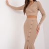 The set consisting of a short long-sleeved sweater and a midi skirt is the perfect combination of comfort and style for everyday looks. Their casual character makes them indispensable in many situations, adding casual charm to any woman’s outfit. The sweater is made mainly of viscose, which is pleasant to the touch, and ensures comfortable wearing all day long. The short cut and long sleeve make it an excellent choice for colder days, providing adequate protection from the cold. The midi skirt made of ribbed material adds a touch of elegance and feminine charm. Its midi length is versatile and fits a variety of silhouettes, while gently emphasizing the legs. In addition, decorative buttons on the front add to its originality and subtlety. This combination of a sweater and skirt creates a complete look that will be perfect for every day, regardless of the occasion. Thanks to high-quality materials and careful workmanship, this set is not only a practical choice, but also a fashionable addition to your everyday closet, which will emphasize the natural grace and style of every woman.