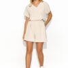 A casual and timeless women’s set sewn from a light and airy fabric will change your perspective on the combination of comfort and elegance. The blouse with a heart neckline, decorated on the sleeve with a minimalist logo plaque, perfectly complements the plain whole and thus allows you to identify the model with the brand. The shorts have practical side pockets and an elastic waistband, which allows for adjustment to many body types. The loose cut does not restrict movement and a slightly higher top optically lengthens the legs. The set comes in three color variants: black, cappuccino and light beige. The women’s set can equally well be worn separately and combined with other items of clothing. It goes well with various accessories and footwear, providing countless possibilities for summer styling.