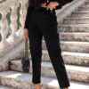 Total look, which is an extremely comfortable set, a short blazer fastened with a gold button and tapered pants ala cigarette pants with a high waist and pockets. The jacket, when fastened, beautifully optically lengthens the neck, creating a V-shaped neckline with two lined lapels. Wonderfully complements the styling with dedicated pants, classic cigarette pants tapering at the bottom, with slip pockets. Made of fleshy, high-quality knit fabric. Durability is combined with a classic look and precise finishing. Margo is a set for many seasons. The set was designed and sewn in Poland. Trouser length measured inside the leg.