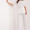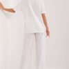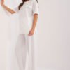 Introducing our new women’s set, consisting of an elegant blouse and comfortable pants. This ensemble is the perfect combination of style and comfort, ideal for both casual outings and work. The blouse is made of high-quality, smooth fabric, giving it an elegant and versatile character. The short sleeves make the blouse perfect for warmer days, providing freedom of movement. The classic round neckline adds a subtle charm to the blouse and complements various stylings. The decorative buttons on the front of the blouse add elegance and serve as a stylish accent. The pants are equipped with a practical tie at the waist, allowing for a perfect fit and highlighting the waist. Made from the same smooth, solid fabric as the blouse, they create a cohesive and elegant set. The straight legs make the pants classic and versatile, seamlessly blending with different wardrobe items. The high waist provides comfort and a sophisticated look, accentuating the silhouette. The practical side slip pockets add functionality without compromising the pants’ elegant appearance. This women’s set, consisting of a blouse and pants, is an excellent choice for women who value comfort and style. The smooth, solid fabric and classic details make this set perfect for everyday outings and work. With carefully selected elements, such as the decorative buttons on the blouse and the tie at the waist of the pants, you will always look elegant and feel comfortable.