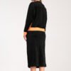 Ladies’ velour set, consisting of a two-color blouse and skirt. Blouse with long sleeves and a round neckline. Pencil skirt with a slit on the right side, wide elastic sewn into the waist, unlined.