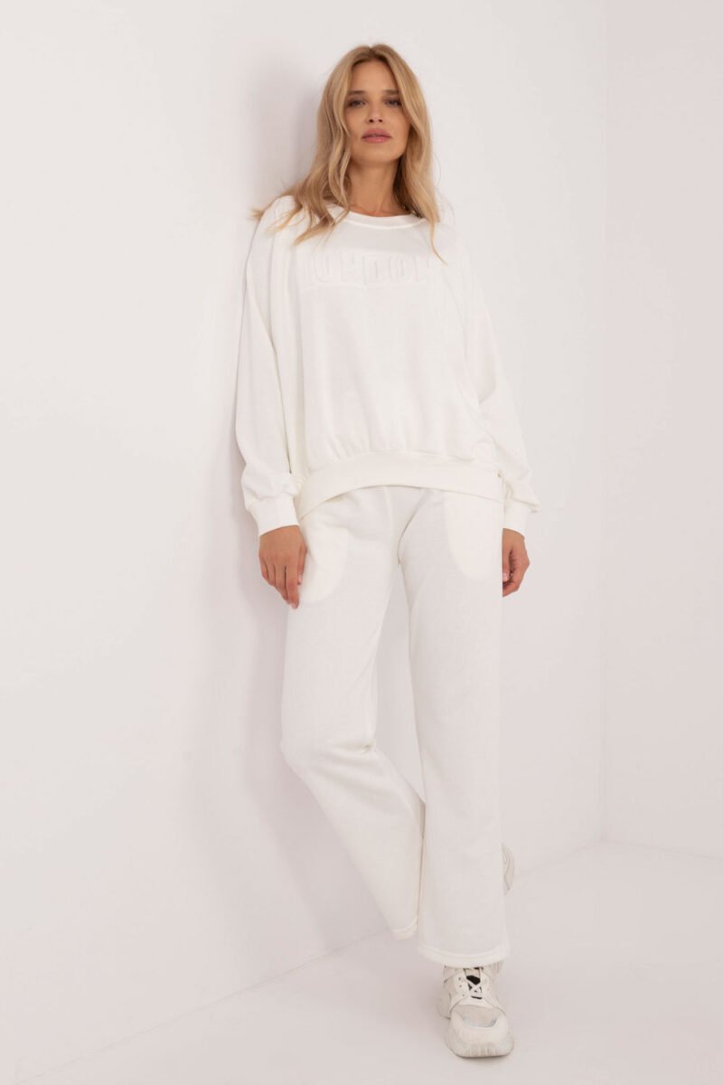 Women’s casual style tracksuit set, ideal for everyday outings, consists of a sweatshirt and pants. Made from a high-quality blend of cotton and polyester, the set provides comfort and durability, while the smooth pattern gives it a versatile character. The sweatshirt has long sleeves, a round neckline and practical patch pockets on the front for a sporty style. On the front there is a fashionable inscription, which attracts attention and adds originality to the whole. The long length of the sweatshirt makes it a comfortable piece of clothing, ideal for pairing with different bottoms. The pants have a straight leg cut and a high waist, which emphasizes the silhouette and provides comfort. The waistband features a drawstring for a customized fit, and the side slip pockets are a practical touch, perfect for storing small items. This set is the perfect combination of style and comfort, a great choice for everyday wear.