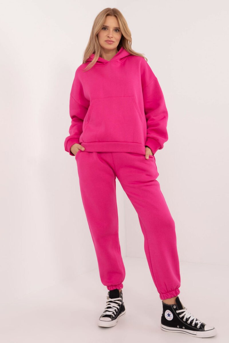 The warmed-up women’s casual sweatshirt set, ideal for everyday colder days, consists of a sweatshirt and pants. The set is made of a soft and warm blend of cotton and polyester for comfort and durability. The sweatshirt has long sleeves, a hood and a large, practical kangaroo pocket, which adds a sporty touch and functionality. Thanks to its insulation, the sweatshirt is ideal for cold days, and its plain pattern adds a classic, versatile look. The long-leg pants, which end in ribbed cuffs, have a high waist to accentuate the waist and ensure comfort. There is a tie at the waist for a perfect fit. In addition, the pants have slip-in side pockets, making them a practical choice for everyday wear. The whole set combines style, comfort and warmth, being an excellent choice for casual styling.