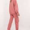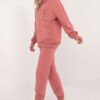 Stylish tracksuit set, consisting of a sweatshirt and pants, perfect for everyday occasions. Made of high quality cotton with a touch of elastane, it provides comfort, flexibility and breathability, ideal for active days. The sweatshirt with a round neckline has a practical pocket on the front decorated with a trendy chain, adding an original accent to the set. The high-waisted pants with slip pockets on the sides are comfortable and functional, and the cuffs at the bottom of the legs ensure a perfect fit. The smooth pattern makes the set versatile and easy to combine with other wardrobe pieces. This is the perfect choice for women who appreciate a combination of comfort and stylish look in their everyday wear.