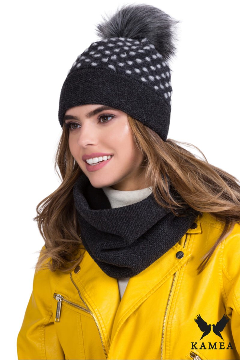 The women’s FOKS set consists of a graphite-colored hat and neck warmer. It is an ideal proposition for women who prefer simplicity and elegance. The hat is decorated with a polka dot pattern and a pom-pom made of eco-friendly materials. It has a wide band at the edge and a warming polar lining. The product is available in four subdued colors.