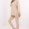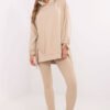 Women’s set consisting of a long sweatshirt and leggings is the perfect choice for women who appreciate comfort and style in their everyday outfits. Maintained in a casual character, it will be perfect for a walk, shopping, or relaxation at home. The sweatshirt has an elongated back, which gives it a modern look and provides additional wearing comfort. Made of a blend of cotton and polyester, it offers a pleasant touch and durability. Equipped with a hood and long sleeves, it perfectly protects against the cold on cooler days. Leggings with narrowed legs and a high waist emphasize the silhouette, while providing freedom of movement. Made of cotton with the addition of elastane, they fit perfectly to the body. An additional advantage is the ribbed material, which adds character and distinguishes them from other models. The whole set is maintained in a uniform, smooth pattern, allowing for easy matching of accessories and creating a coherent, everyday look.