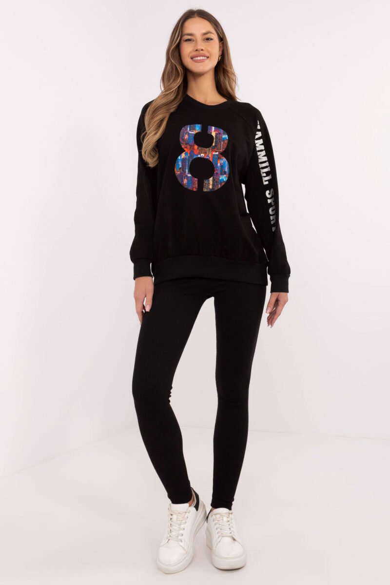 Women’s set consisting of a sweatshirt and leggings is an excellent proposition for everyday, casual stylizations. Ideal for women who value comfort, while wanting to look fashionable and stylish. The sweatshirt with a classic cut, round neckline, and long sleeves is made of high-quality blend of cotton, polyester, and elastane. It is pleasant to the touch, elastic, and durable, providing comfort throughout the day. Subtle patches and embroideries on the sleeve and front give it a unique character, emphasizing the modern design. Leggings with tapered legs and a high waist are the perfect complement to the set. Made of cotton with a touch of elastane, they perfectly fit the silhouette, providing full freedom of movement and comfort. The whole set is kept in a smooth pattern, making it versatile and easy to combine with various accessories. It is a perfect choice for everyday outings, relaxation, or activities in a casual style.