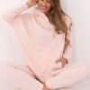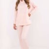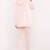 Women’s tracksuit set is a perfect combination of comfort and style, ideal for everyday activities. Made of a soft blend of cotton and polyester, it provides comfort and material durability. The sweatshirt has a classic, casual cut with long sleeves finished with ribbing. On the front, there is a practical kangaroo pocket that adds a sporty character and is perfect for storing small items. The smooth pattern of the sweatshirt makes it versatile and easy to style for everyday wear. The pants stand out with a high waist that accentuates the silhouette, and with cuffs at the bottom for a perfect fit. Side, slip pockets are a practical element that enhances the functionality of the pants. This set is a perfect choice for women who value comfort and a fashionable look for everyday wear. The smooth texture and understated design make the set suitable for any casual occasion.