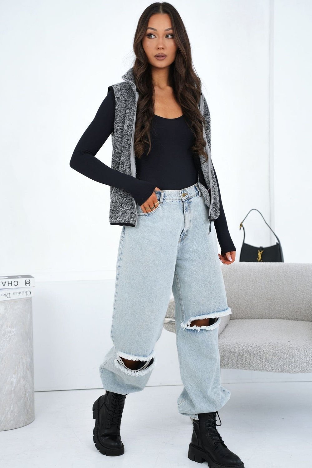 Comfortable and stylish women’s tracksuit set is the perfect choice for everyday activities. The set consists of a short, loose-fit hoodie with a hood and a front zipper reaching halfway, providing practicality and the possibility of adjusting the styling. The long-sleeved hoodie perfectly protects against the cold, and its mélange pattern adds a modern character. High-waisted pants with wide legs provide comfort and a fashionable look. The elastic waistband ensures a perfect fit, and the side slip pockets are a practical solution for small items. The pants are long, making them an ideal choice for cooler days. Made of a soft blend of cotton and polyester, which ensures comfort, durability, and proper thermoregulation. The set will be great for walks, meetings with friends, or relaxing at home.