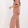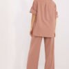 Light and stylish women’s set, perfect for everyday wear. Made of breathable linen, it provides comfort and excellent air circulation, making it an ideal choice for warmer days. The smooth material gives it a natural, minimalist look. The loose-fitting shirt with 3/4 sleeves has a classic collar and button closure, adding elegance. The tie at the waist subtly emphasizes the silhouette. High-waisted pants with wide legs guarantee freedom of movement, and side slip pockets add practicality. This is a great choice for women who appreciate a casual style, comfort, and natural materials!