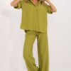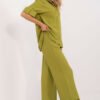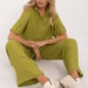 Light and stylish women’s set, perfect for everyday wear. Made of breathable linen, it provides comfort and excellent air circulation, making it an ideal choice for warmer days. The smooth material gives it a natural, minimalist look. The loose-fitting shirt with 3/4 sleeves has a classic collar and button fastening, adding elegance. The tie at the waist subtly accentuates the silhouette. High-waisted pants with wide legs guarantee freedom of movement, and side slip pockets add practicality. This is a great choice for women who appreciate casual style, comfort, and natural materials!