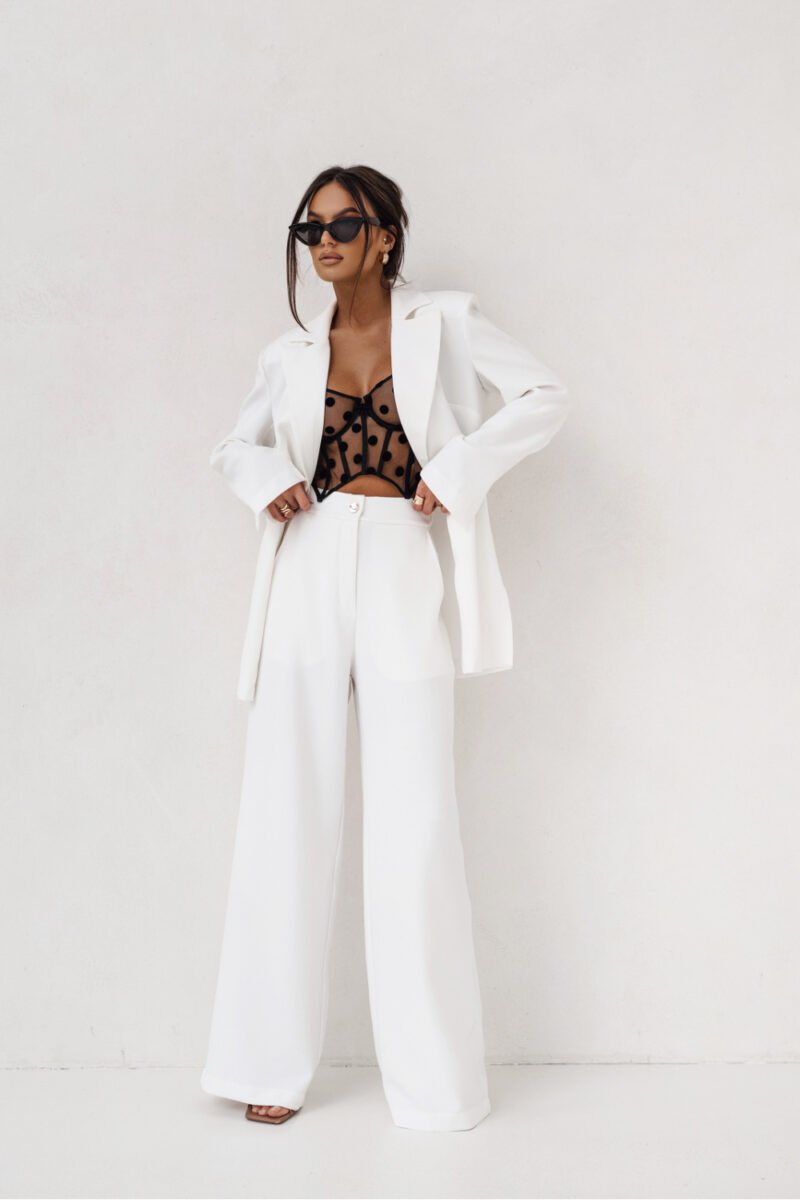 The ecru suit is the perfect choice for women looking for elegance and comfort. Made of high-quality materials, the suit combines modern style with a classic cut, making it an excellent solution for various occasions, both for the office and formal events. Its timeless color makes it easy to pair with other clothing items. The suit jacket features a well-thought-out cut that accentuates the feminine silhouette. The trousers, which are part of this suit, have also been designed with comfort and attractive appearance in mind. The material composition of the suit is 95% viscose and 5% elastane, ensuring durability, elasticity, and comfort when wearing. By choosing this model, you are opting for quality and style that will accentuate your personality and allow you to stand out in any situation. Choose the suit and enjoy a perfect look!