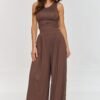 Loose women’s set is the perfect proposition for women who are looking for a combination of comfort and elegance. The set includes a fitted top with straps additionally embellished with ruches on the sides and wide high-waisted trousers, which together create a fashionable and comfortable styling. Made of lightweight, breathable viscose, the set is perfect for warm days, providing a feeling of freedom throughout the day. The set is simple but impressive, combining comfort with a modern look. It can be worn both for everyday wear and for less formal meetings. It pairs perfectly with white sneakers or sandals, creating a casual look, but also goes well with more elegant accessories. Undoubtedly, the advantage of this set is the material, which is characterized by excellent breathability, making it comfortable to wear, even for long hours. Our viscose set is a proposal for summer, combining stylish design with comfort. Excellent for work, social meetings, and relaxing days in the garden. Invest in this fashionable set that will provide you with comfort and style throughout the day!