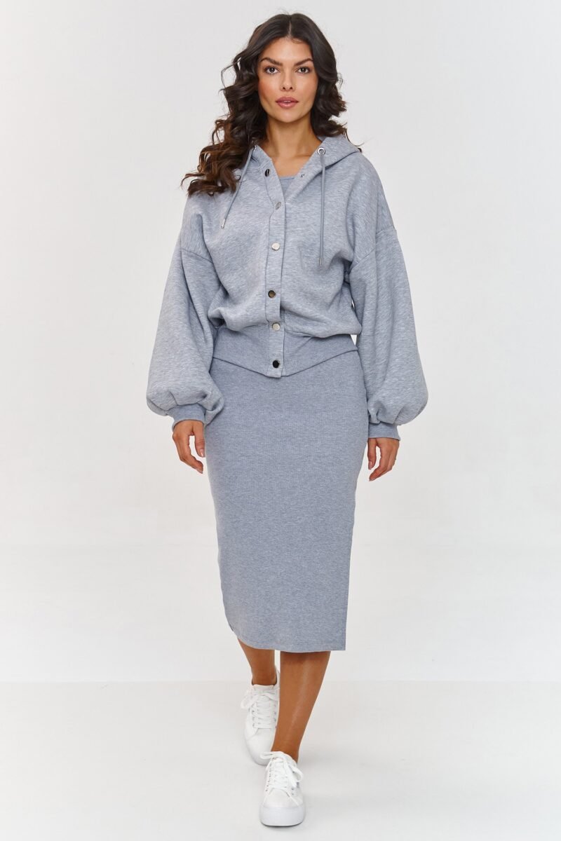 One set, many possibilities! A sleeveless striped dress and a zip-up hoodie are a set created for women who value comfort and versatility. With these two elements, you can adjust your outfit to any season – wear the dress alone in the summer, and complement the look with a warm hoodie on cooler days. The striped dress fits the silhouette, accentuates the shape, but does not restrict movement, and the additional side slit adds femininity and sensuality. The hoodie with a hood has a comfortable closure, making it suitable for many outfits. Additionally, it is made of thicker sweatshirt material, making it so versatile that you can use it as a complement to any outfit for any season. The hoodie is designed in a loose, oversized cut, providing full freedom of movement. The ribbed cuffs and bottom add a trendy touch to the overall design. Wear the dress alone on warmer days and enjoy a light, feminine look. When it gets cooler, simply throw on the hoodie with snaps to create a casual, practical outfit, perfect for work, a walk, or quick shopping. You can wear these items together or separately, combining them with other clothing such as sneakers, ankle boots, or trainers. This set goes with everything! Choose a stylish and functional set that will adapt to your lifestyle!