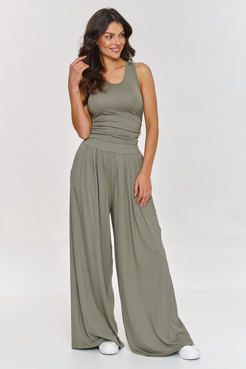 A loose women’s set is the perfect choice for women looking for a combination of comfort and elegance. The set includes a fitted camisole top with ruching on the sides and wide high-waisted pants, creating a fashionable and comfortable outfit together. Made of lightweight, breathable viscose, the set is perfect for warm days, providing a feeling of freedom all day long. The set is simple but eye-catching, combining comfort with a modern look. It can be worn both casually and for less formal meetings. It pairs well with white sneakers or sandals, creating a casual look, but also goes well with more elegant accessories. The undeniable advantage of this set is the material, which is characterized by excellent breathability, making it pleasant to wear even for long hours. Our viscose set is a summer proposal that combines stylish design with comfort. Perfect for work, social meetings, and relaxing days in the garden. Invest in this fashionable set that will provide you with comfort and style all day long!
