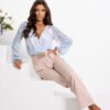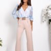 Elegant and stylish set that enchants with a subtle combination of colors. The airy blouse in a delicate multicolored pattern (blue, beige) gives the styling lightness and feminine charm. The wrap neckline beautifully accentuates the neck, and the looser cut ensures comfort when wearing. The pants in a solid beige color perfectly complement the whole outfit, the elastic waistband guarantees a perfect fit, and the belt with a decorative buckle accentuates the waist. It is a harmonious combination of classic and modernity, perfect for any occasion.