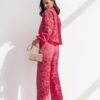 Elegant and feminine three-piece lace set that enchants with subtle style and attention to detail. The button-up shirt with long sleeves finished with an elastic band adds lightness and romantic charm. Underneath, there is a camisole made of smooth, non-transparent material, ensuring comfort when wearing. The long pants with a covered zipper and slip pockets perfectly emphasize the silhouette. Additionally, a special lining has been sewn into the upper part of the pants to prevent transparency. This is the perfect set for special occasions, combining the delicacy of lace with classic elegance.