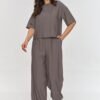 This elegant set is the perfect proposal for spring and summer days when you want to combine a fashionable look with high quality. The set includes a loose blouse with a boxy cut, which is perfect for elegant stylizations. The short sleeve and simple blouse cut make it an excellent option for both formal and less formal outings, combining elegance with comfort. The trousers stand out with wide legs, giving the outfit a modern and elegant look. The elastic waistband ensures comfort while their length adds class and style. The model is made of delicate and lightweight material imitating linen. The simple yet refined cut gives the set a timeless character that will look stylish on any silhouette. The set will work perfectly for business meetings, elegant outings, or trips to the city when you want to combine elegance and freedom. You can pair it with heels, elegant sandals, or white sneakers.