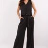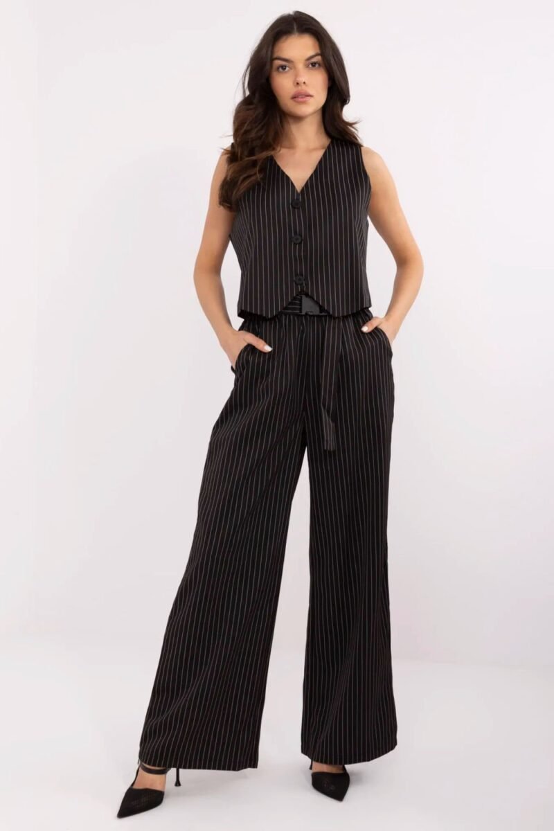 Women’s set consisting of a vest and trousers is an elegant and stylish proposal for various occasions, both for work, everyday wear, and for formal meetings. Made of high-quality linen and viscose, it provides breathability, comfort, and perfect fit to the silhouette. The set is distinguished by a classic striped pattern, which adds elegance and visually slims the figure. The sleeveless vest with a V-neckline, buttoned, is additionally equipped with a lining, which emphasizes its elegant character. The set includes a belt, which beautifully emphasizes the waist. Long, wide trousers with a high waist ensure comfort and freedom of movement. Side, slip pockets add practicality, and the whole creates a coherent, modern, and feminine look. This set is an ideal choice for women who appreciate elegance in their everyday style.