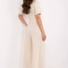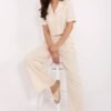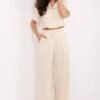 Women’s set consisting of a short shirt and pants is an ideal proposition for everyday stylizations in a casual style. Made of breathable linen and viscose, it guarantees comfort and freedom of movement, perfectly suited for warmer days. The shirt has a short cut, with a classic collar and short sleeves, buttoned up, giving it a stylish and light character. The smooth pattern makes the set versatile and easy to style. Long, wide pants with a high waist beautifully emphasize the waist and visually lengthen the legs. The model is fastened with a button and a zipper, and the side pockets add functionality. This set is created for women who value comfort and a fashionable, minimalist look, perfect for everyday wear, in the city or for summer gatherings.