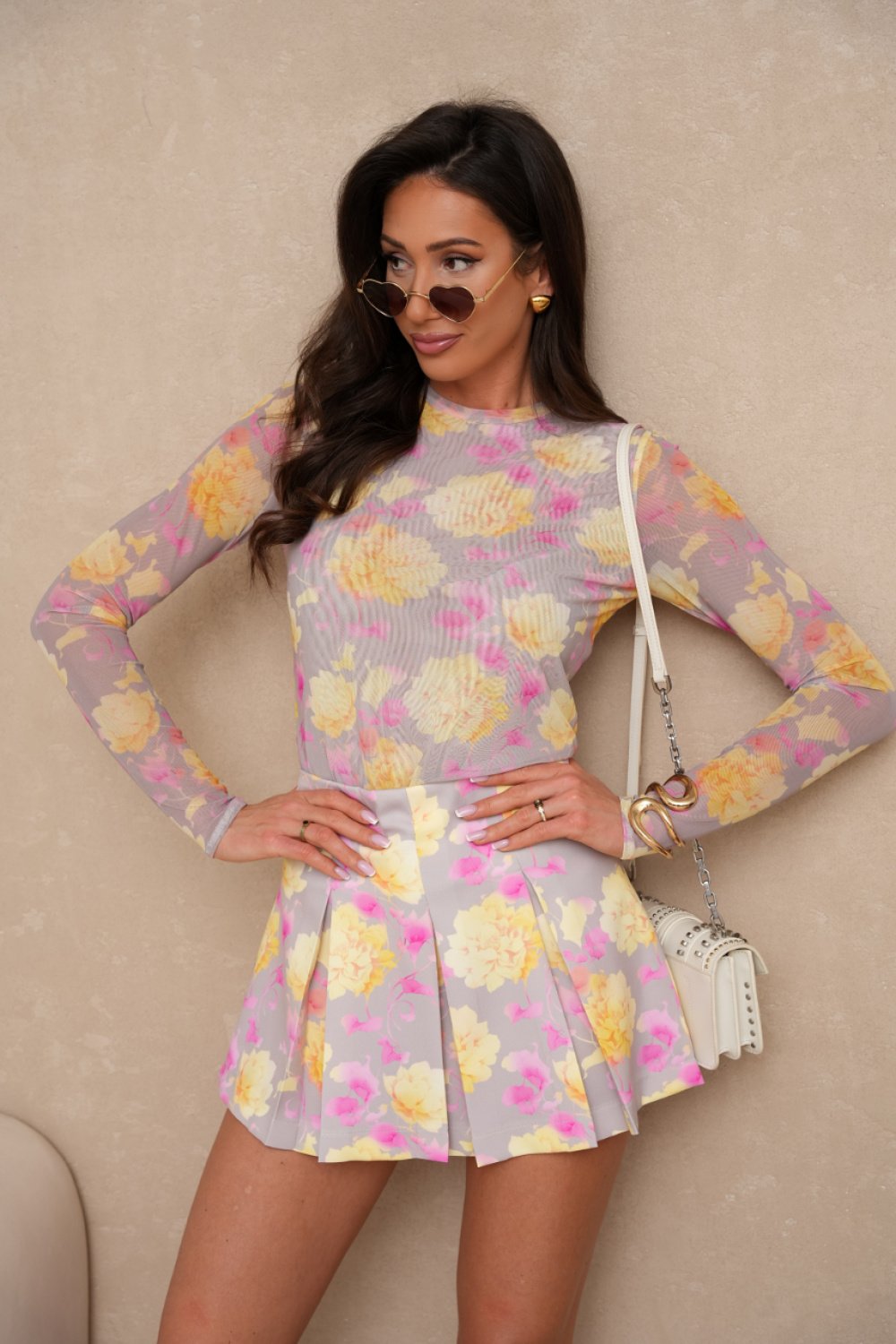 Elegant and stylish women’s set that combines subtlety with modern design. The blouse made of light, transparent tulle with long sleeves and a round neckline adds feminine charm and delicacy to the styling. The skirt shorts are a functional and fashionable solution, fastened with a hidden zipper, ensuring comfort when wearing, and the front pleats add an elegant character and lightness to them. The colorful print attracts attention and gives the whole a unique expression. An ideal choice for special occasions, social gatherings, or fashionable urban stylizations.