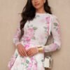 Elegant and stylish women’s set that combines subtlety with modern design. The blouse made of lightweight, transparent tulle with long sleeves and a round neckline gives the styling feminine charm and delicacy. Skirt shorts are a functional and fashionable solution, fastened with a concealed zipper, ensuring comfort and the front pleats add an elegant character and lightness. The colorful print attracts attention and gives the whole a unique expression. Perfect choice for special occasions, social gatherings or trendy urban stylizations.