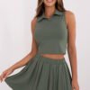 Sporty women’s tennis set is the perfect combination of comfort and style. It consists of a fitted sleeveless top with a collar and a flared skirt with built-in shorts, which provide comfort and freedom of movement. The high waist accentuates the silhouette, and the elastic waistband guarantees a perfect fit. Made of high-quality polyamide and elastane, the set is lightweight, breathable, and perfect for everyday wear as well as during sports activities. The smooth design gives it a universal character, and the lack of pockets emphasizes the minimalist style. The mini length adds a feminine charm, making this set a great choice for active women who appreciate fashion and functionality. Shorts are made of 95% polyester, 5% elastane.