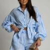Ladies’ muslin set is a light and stylish proposition perfect for warmer days. Made of breathable, soft muslin, it provides comfort and a casual, feminine look. The set includes a button-up shirt with a classic collar and eye-catching, long and wide sleeves that add lightness and a fashionable character to the whole look. The high-waisted shorts have a tie at the waist and slip pockets on the sides, making them not only comfortable but also practical. The blue check pattern adds charm to the set and makes it perfect for both everyday wear and holiday trips.